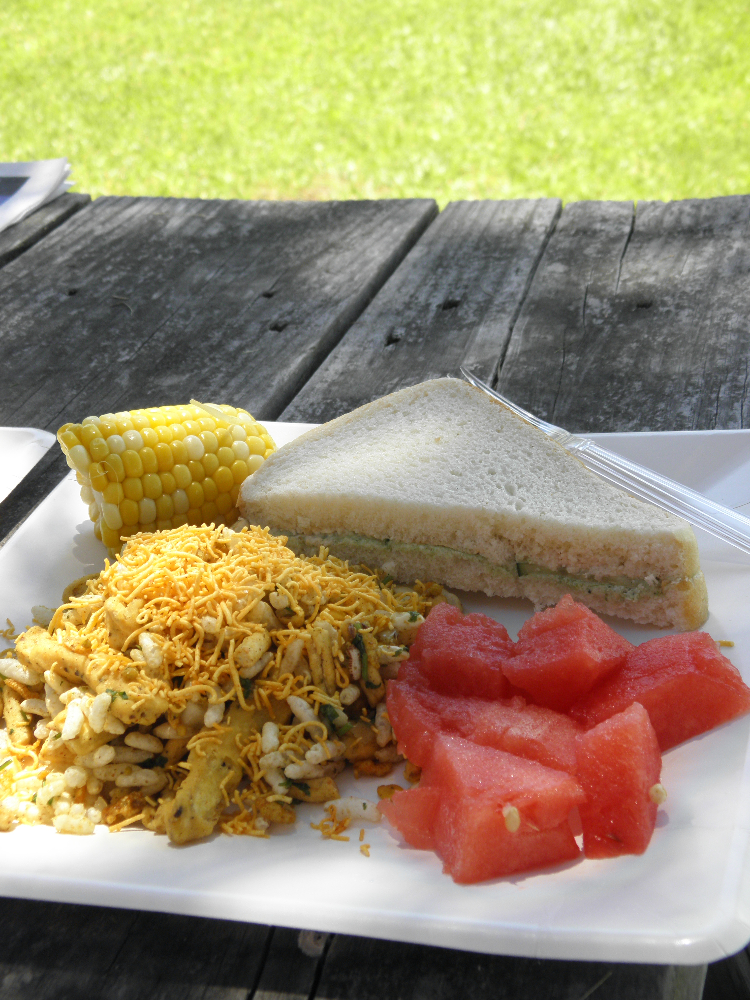 So here in America, I started packing bhel for our summer picnics, with the dry and wet ingredients ready to be mixed on site, and the concept of bhel in a bag was born! So as soon as the weather got warm this year, we headed off to the harbor islands with our favorite picnic menu – bhel in a bag, chutney and cucumber sandwiches, cut watermelon, and corn on the cob!