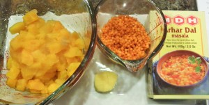 - In a 2 quart pan, simply combine the masoor dal, butternut squash, ginger, curry powder, water or broth and the sea salt and cook it over medium high heat for about 20 to 25 minutes or until the masoor dal is cooked soft. The masoor (red lentil) dal turns yellow when cooked and will be soft with cracked edges on the little individual dal.