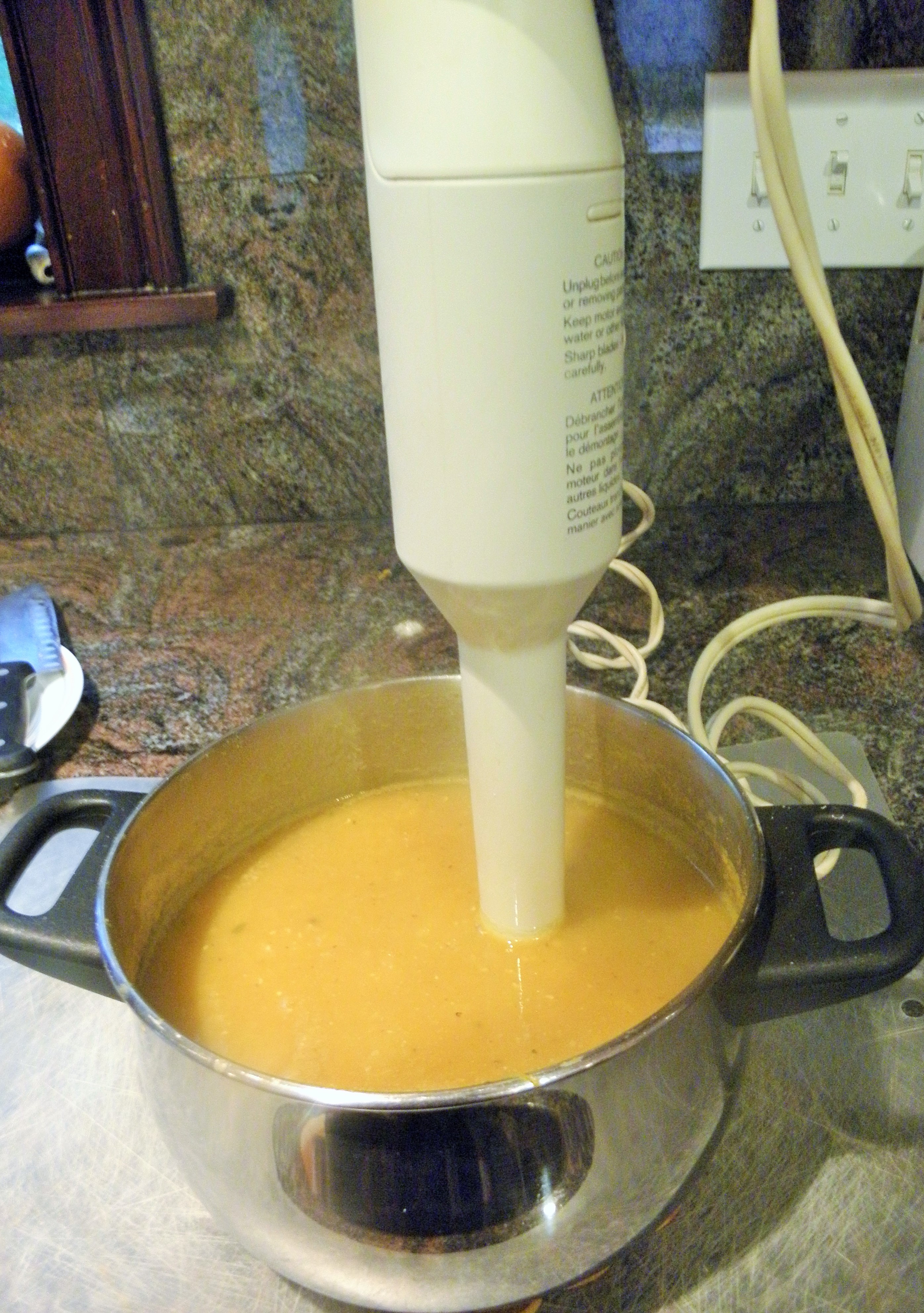 - Remove from heat and blend using an immersion blender or a regular blender. Be very careful as the mixture is hot. Or let the mixture cool and then proceed. I like the silky smoothness of the blended soup so I use the electric blender. It will taste absolutely fine blended with a hand held whip.