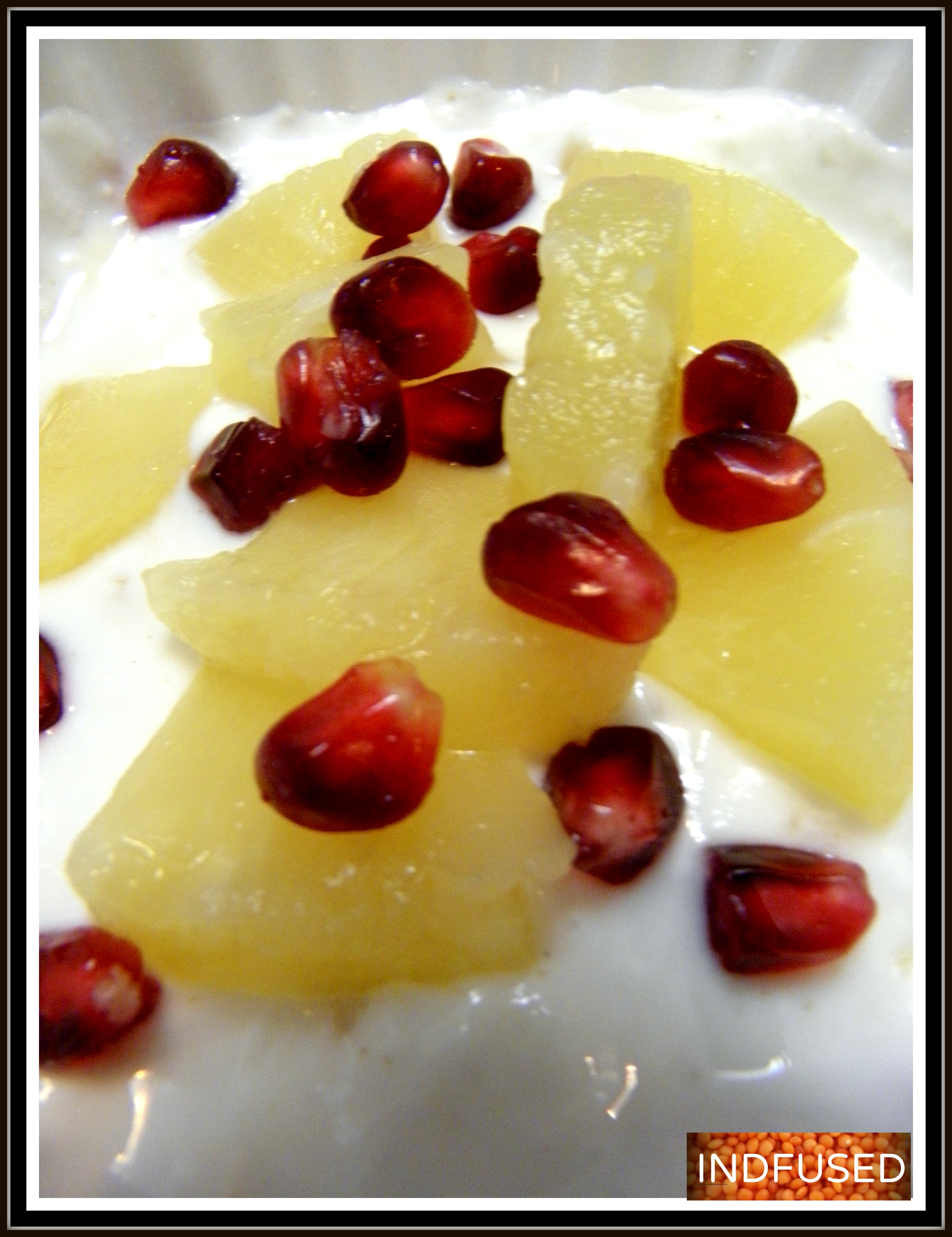 - Add the pineapple and the pomegranate arils. Combine and serve cold.