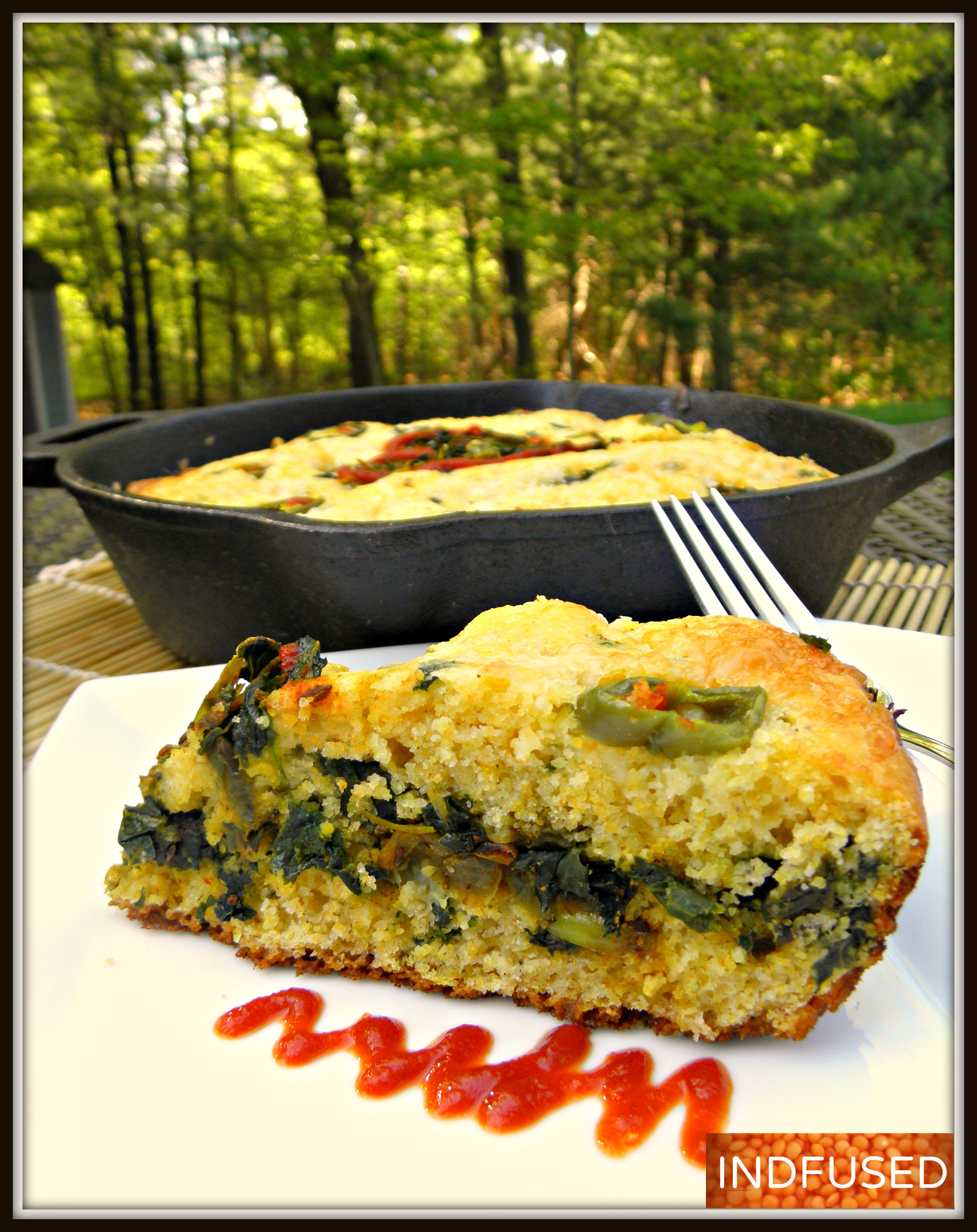 This sandwich, baked right in the skillet, is a breeze to make! I made it extra easy by using frozen chopped kale and boxed cornbread mix. The kale spiced with cumin, garlic caramelized onions and garam masala is delicious and also keeps the cornbread moist. So I skipped the 1/3 oil suggested on the cornbread box.