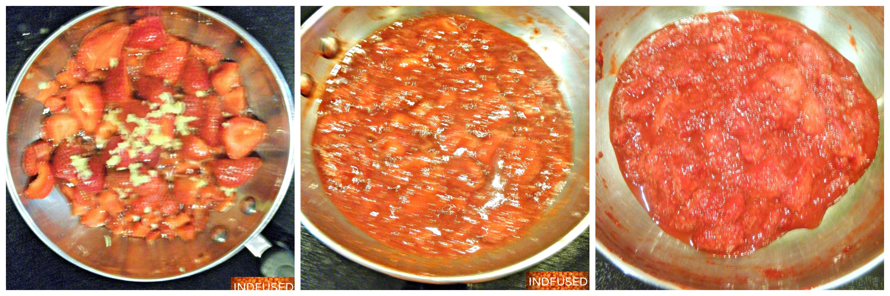 - Combine the strawberries, honey, ginger, the serrano pepper (if using) and the salt in a pan. Let it cook over medium heat for about 6 minutes.You will see the color change and deepen.