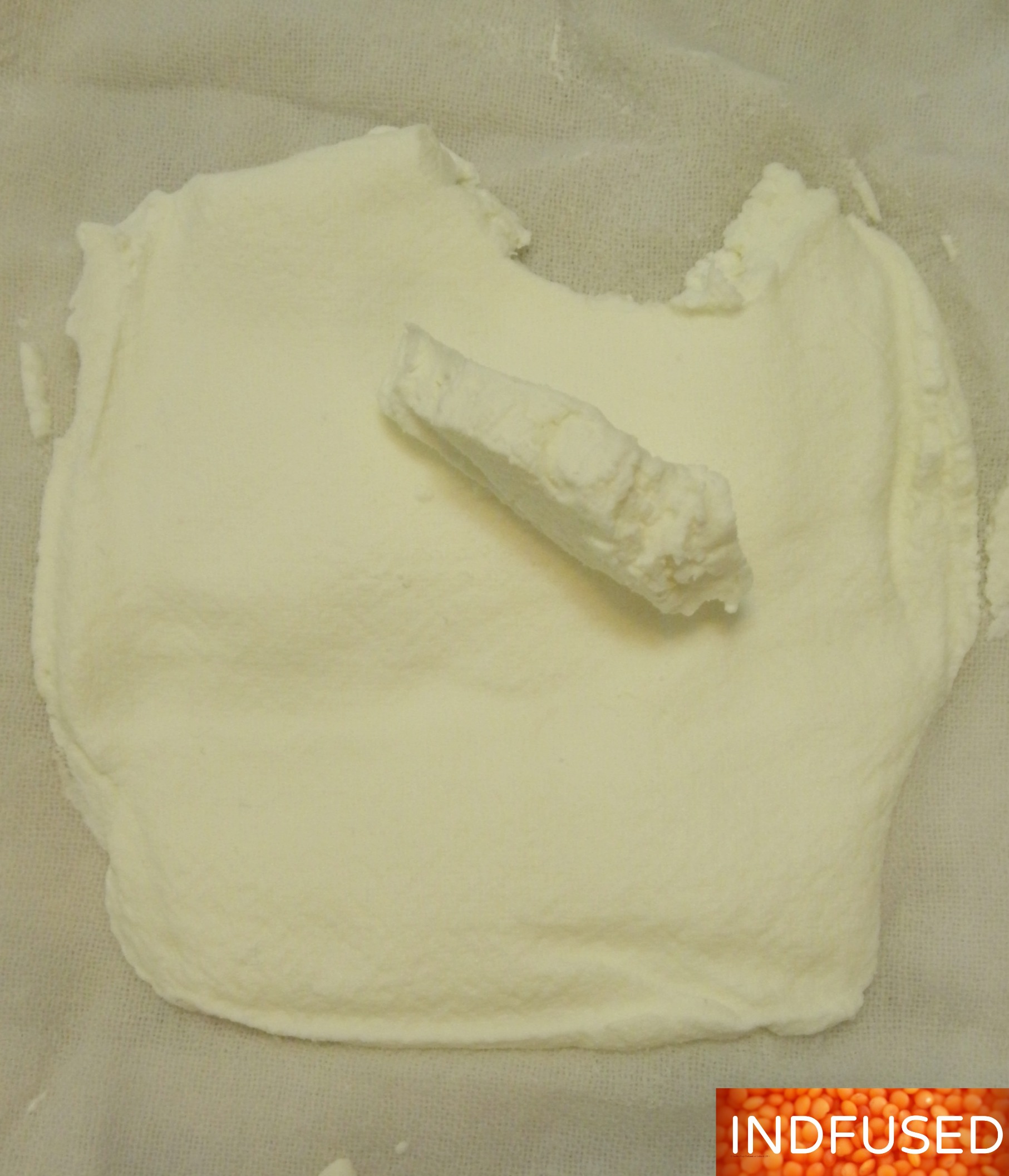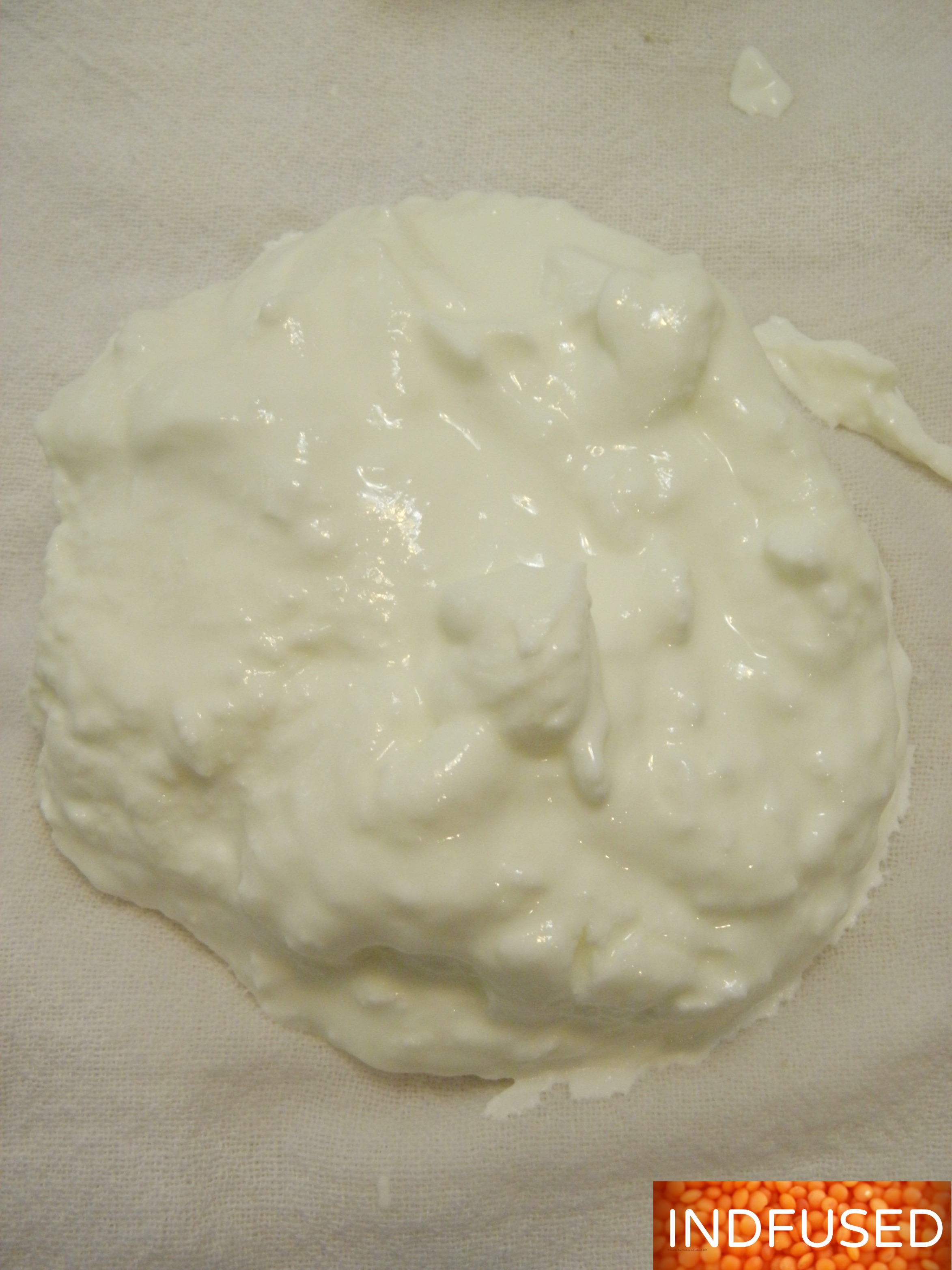 Then sandwiched this package in paper towels between 2 stacks of newspaper ads and placed a heavy weight on it-in this case my stone mortar and pestle. Leave it alone for about 25 minutes. This method helps get rid of the extra liquid/whey in the Greek yogurt in such short time.