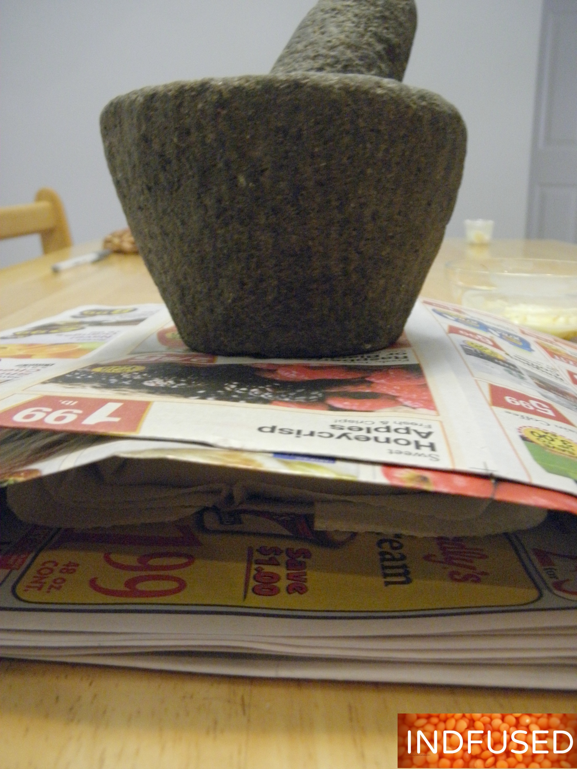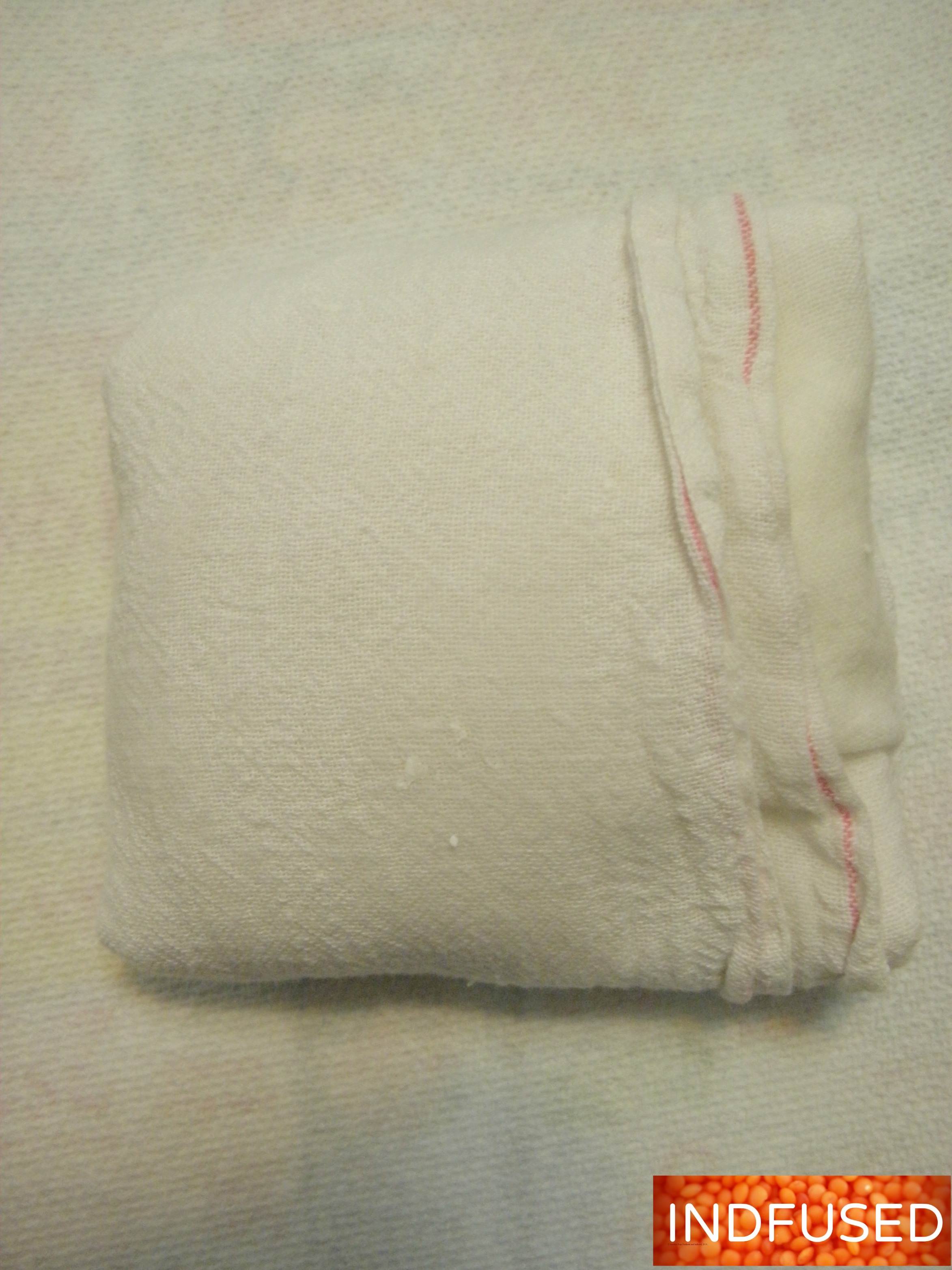 After 25 minutes, I remove the mortar and pestle weight, throw away the soaked newspapers and paper towels and open my cheesecloth package.