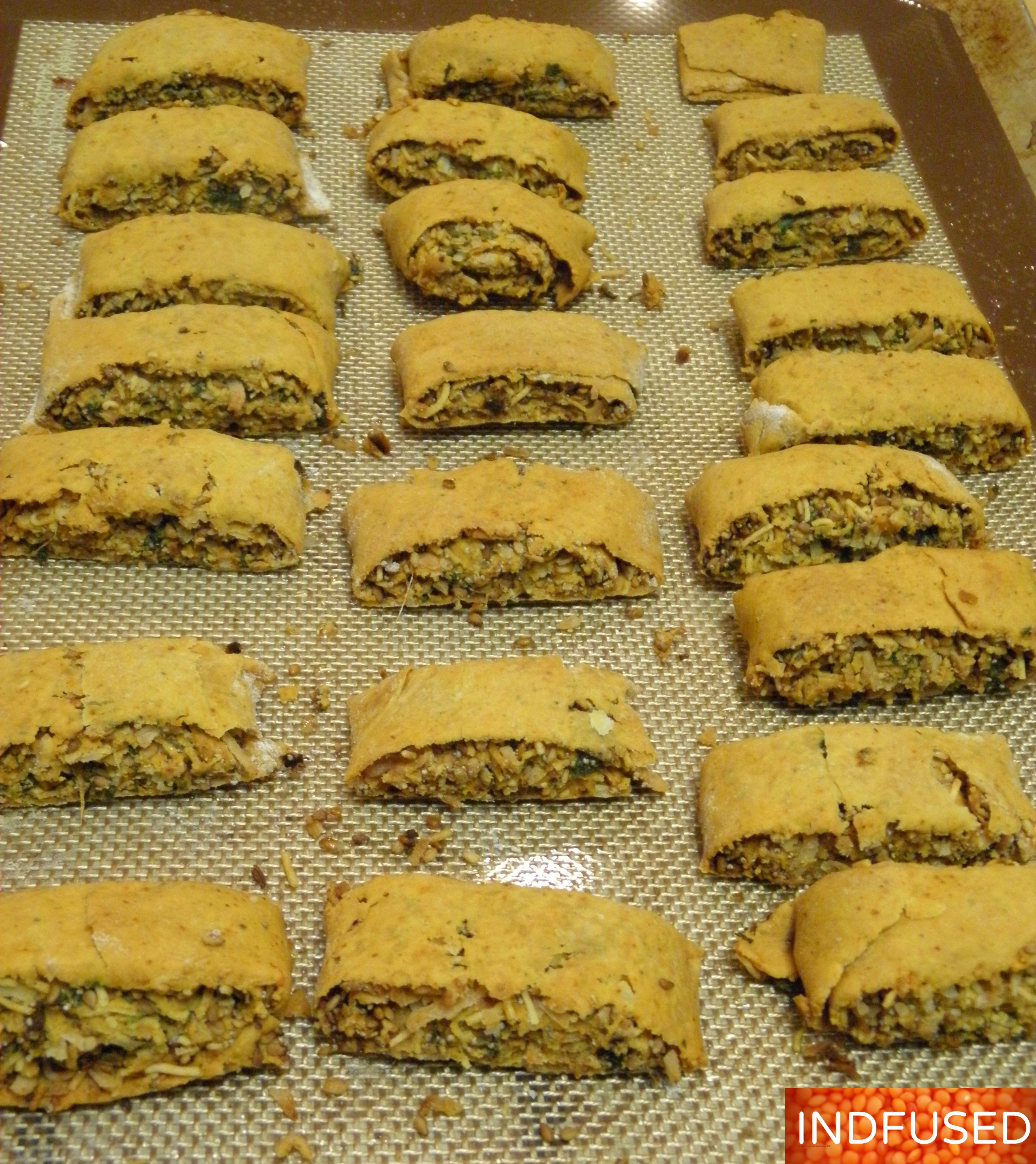 - Brush the tops of the cut pieces lightly with oil and bake for 30 minutes. Flip the bakarwadis upside down and bake for another 10 minutes to get an even color all around.