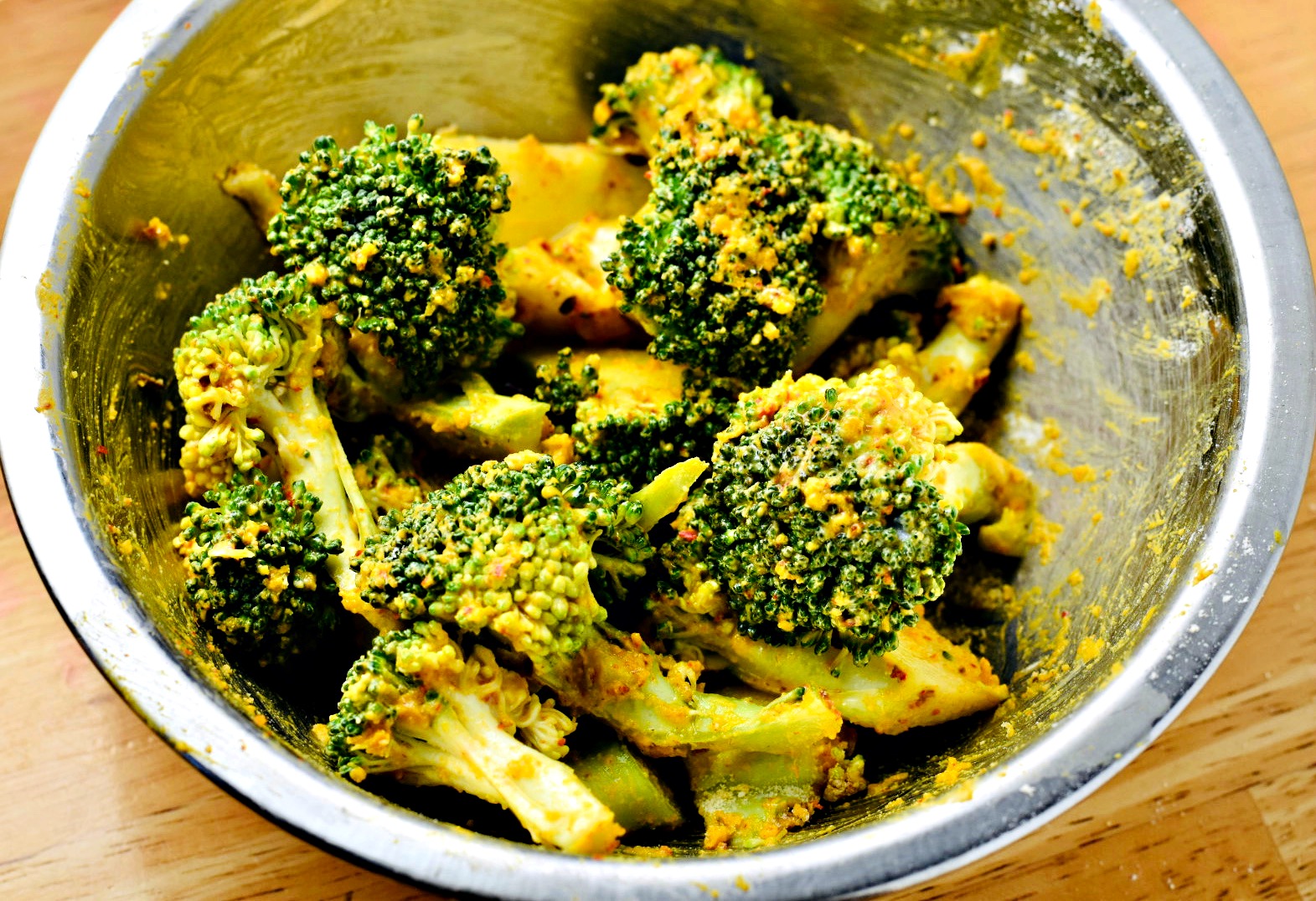 - Sprinkle the besan over the coated broccoli and lightly toss again.