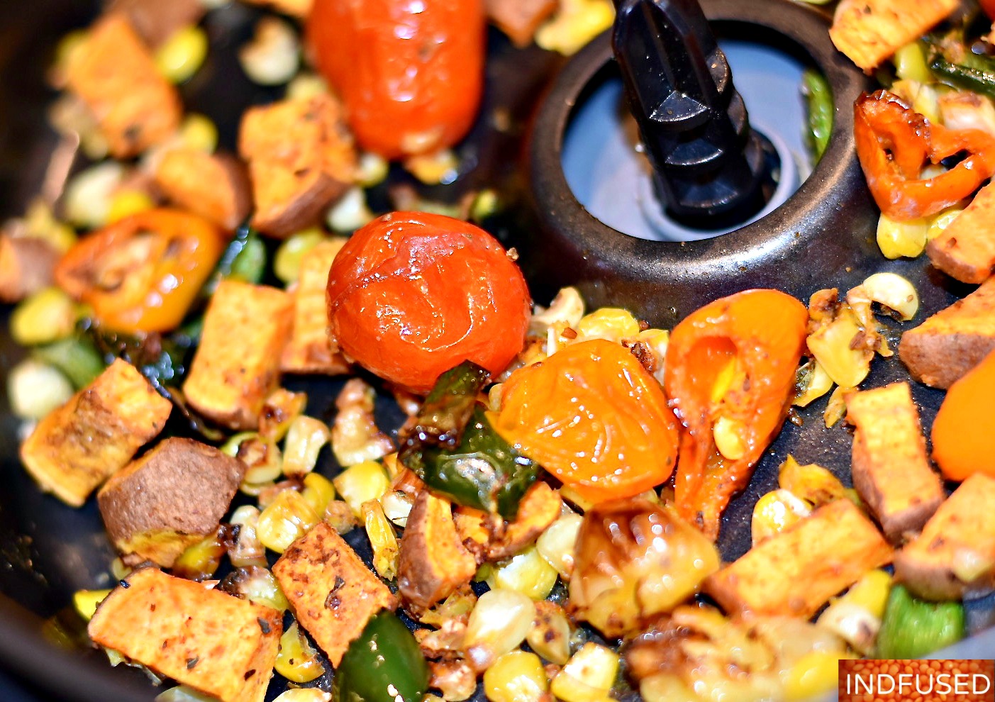Vegetarian, gluten free tostadas with air fryer roasted veggies, pickled red cabbage and delectable Avocado Chutney Sauce!