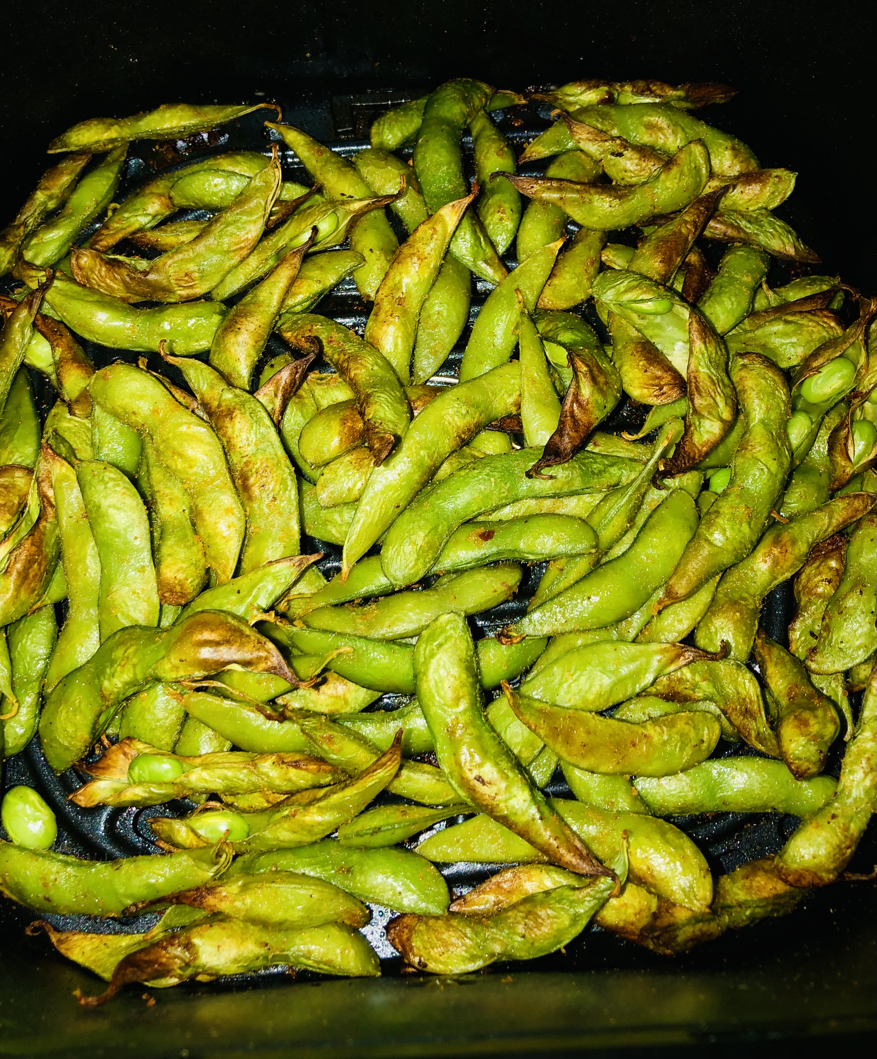 With Indfused’s recipe for Spicy Seared Edamame as the guide, this recipe was developed for the air fryer. It cooks faster in an air fryer and the amount of oil was almost nil!
