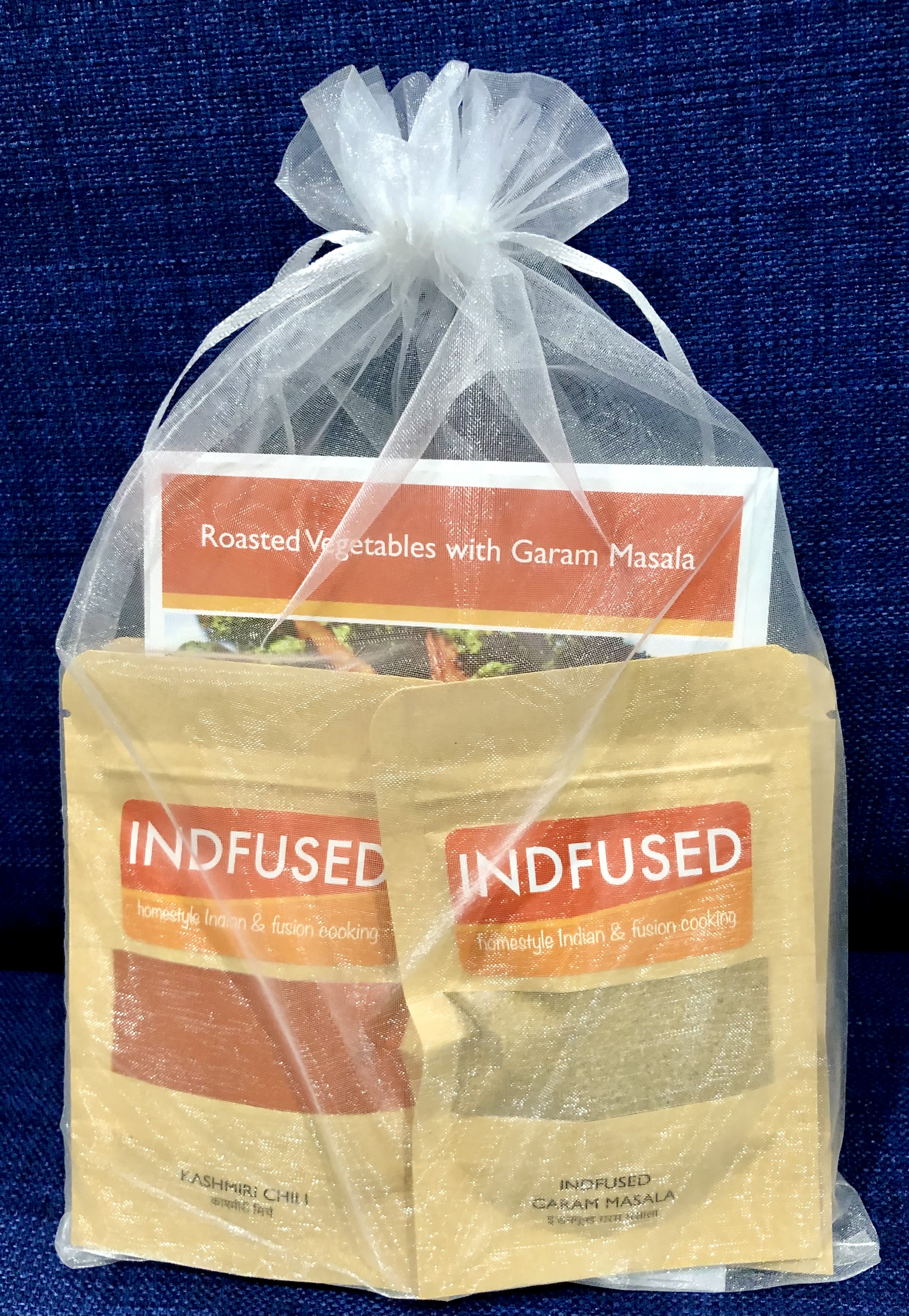 - 6 (1 oz.) packages of turmeric, Kashmiri chili powder, cumin seeds, mustard seeds, INDFUSED C+ C masala, and INDFUSED garam masala